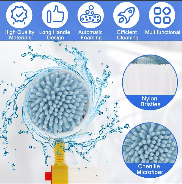 Cepillo de Lavado 5 en 1 con Mango Largo + Espuma Automática + Cabezal Giratorio 360º