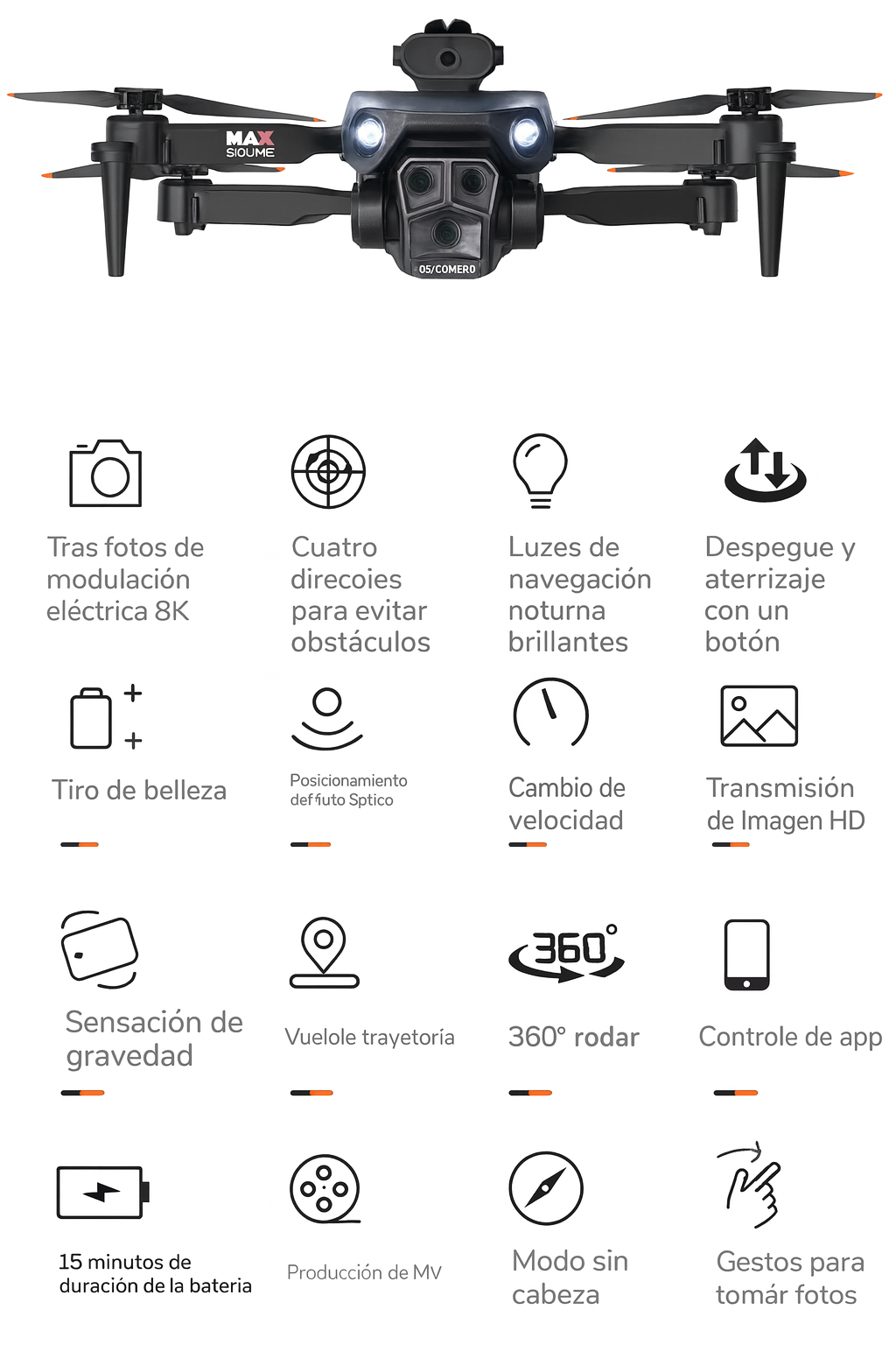 • Funciones: despegue/aterrizaje con un solo botón, modo estable, retorno automático, giros 360°.